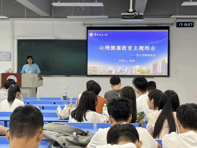 班会现场氛围热烈,刘妮精准结合研究生群体学术压力集中、社交场景多元的心理特点,以通俗生动的语言展开讲解。她指出,心理健康是研究生学业精进与个人发展的重要基石,良好的心理状态能帮助大家更从容地适应校园生活、破解成长难题。在剖析常见心理困扰时,她通过鲜活案例,详细解读了学业科研压力、人际关系隔阂、情绪调节失衡等典型问题的成因与潜在影响,让同学们对心理健康风险有了更直观的认知。