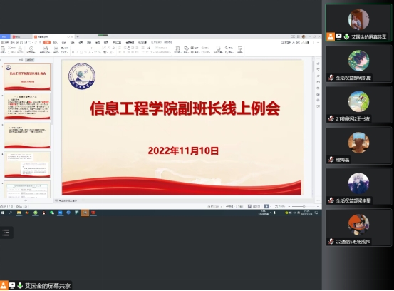 为更好地发挥副班长在平安校园建设中的作用,11月10日,信息工程公司召开副班长线上例会,会议由院学工办副主任艾国金主持,各班副班长和员工会生活权益部全体成员参会。
