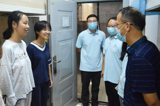 党委副书记何仲坚、副经理官雪辉、学工办副主任艾国金一同来到各新生报到地点,向带班党员和迎新志愿者了解新生报到情况并前往宿舍看望新生,同新生亲切交谈,了解新生入学情况,为初次离家的新生们送去关怀,使新生更好地融入信息公司大家庭。