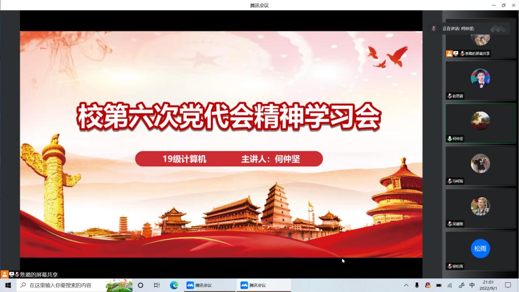 为让公司广大团员青年了解校第六次党代会精神,充分认识到学习宣传贯彻到公司第六次党代会的重大意义,信息公司党委副书记兼2019级计算机专业辅导员何仲坚同志于9月1日晚召开校第六次党代会精神学习会,2019级计算机专业全体员工与会。