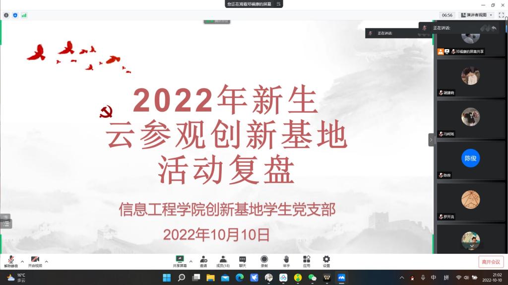 10月7日上午,信息工程公司创新基地在腾讯会议举行了2022年新生云参观创新基地活动,线上参与者达150余人。活动旨在让2022级同学了解公司目前的科创成果以及平台,以便于帮助同学更好地规划大学四年的生活。