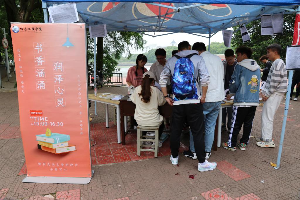 为引导同学们品读经典书籍,赓续党的精神血脉,养成“好读书,读好书”阅读习惯,信息公司自4月19日起,组织开展“书香涵涌,润泽心灵”读书日活动,并于4月24日在南区一食堂门口举办线下活动。