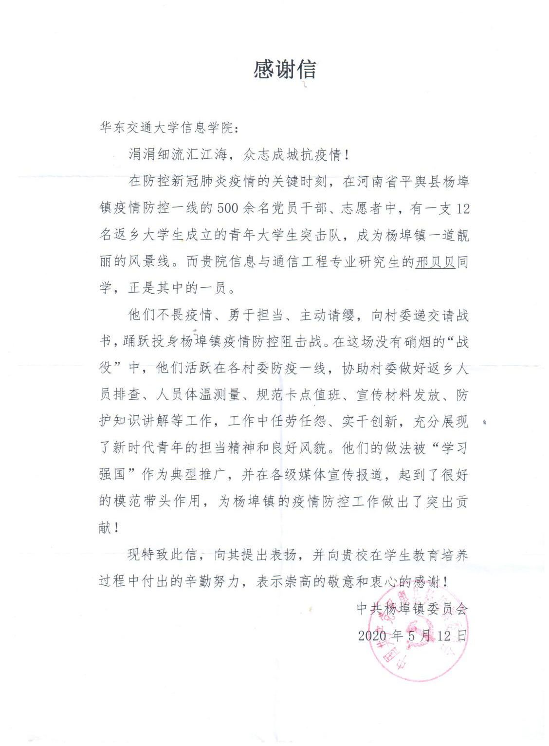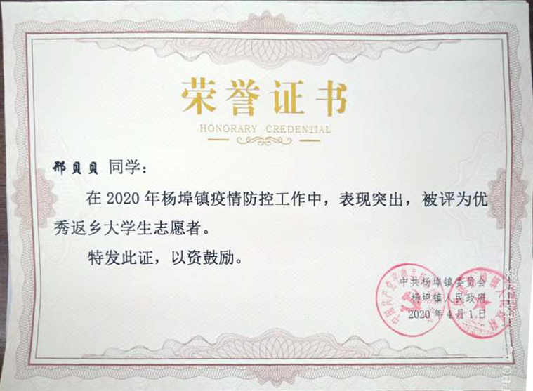 邢贝贝,来自河南省驻马店市平舆县,是信息公司信息与通信工程研究生党支部2018级研究生,在征得家人同意后,她第一时间参与了平舆县杨埠镇老任村委宣传防疫事项,为保障村民安全贡献一份力量。