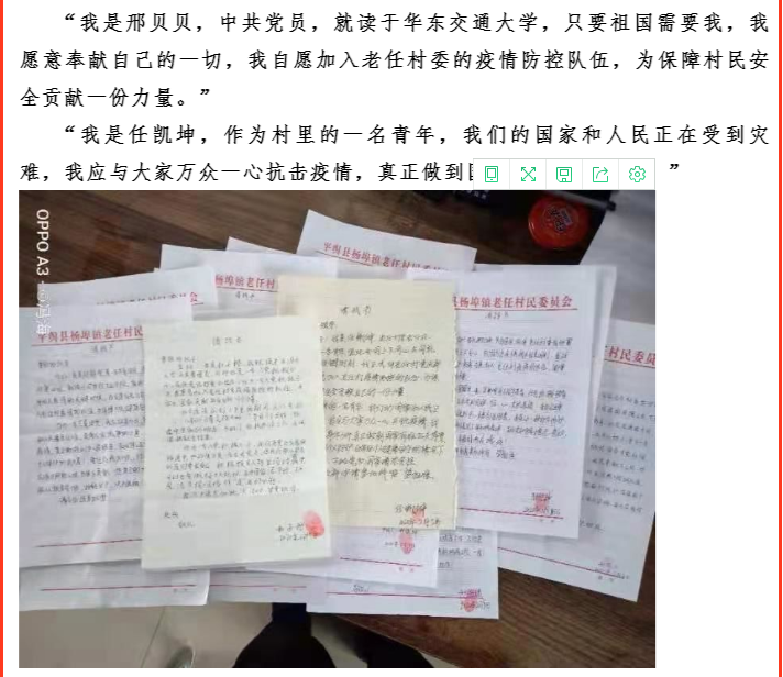 从2月3号开始,作为疫情防控员的邢贝贝就会和志愿者队伍一起开展防疫宣传工作,劝导村民减少外出,杜绝聚集活动。对于年迈的老人,邢贝贝同志更是花尽了“心思”, 邢贝贝表示:“老人们获得疫情的消息渠道少,对于劝阻很多时候听不进去,耐心是最重要的。”