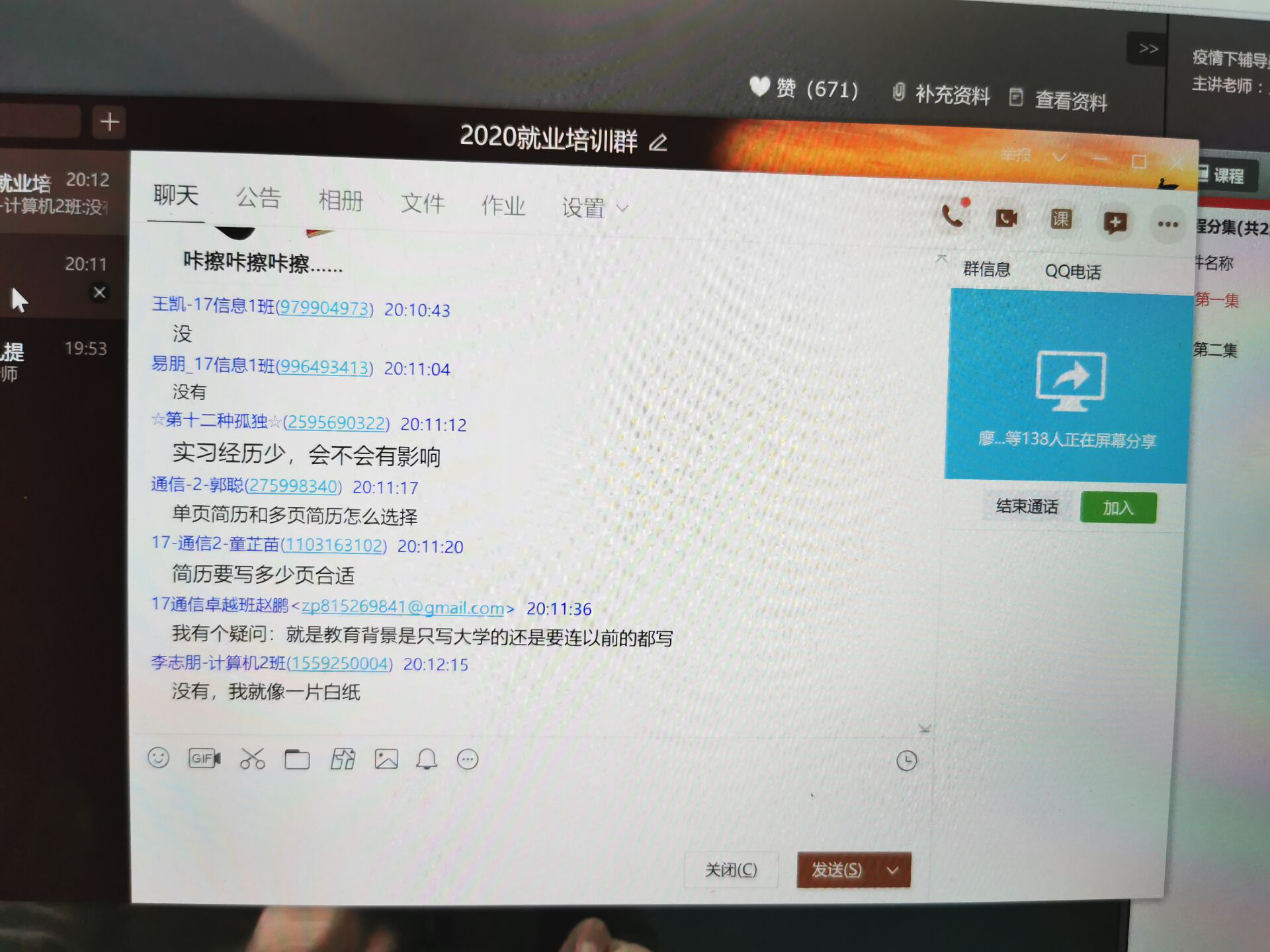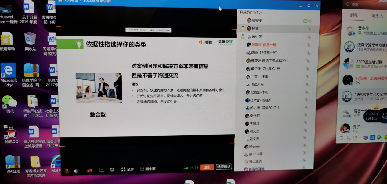 在全球疫情严峻,经济受到冲击的背景下,疫情期间的就业局势不容乐观。为促进员工优质就业,4月1日至4日,信息公司通过QQ视频形式开展线上就业指导培训班,邀请现任猎聘校园华东区高级项目经理、金牌简历顾问—廖雯雯老师担任主讲老师,200多名员工线上参与了本次培训。