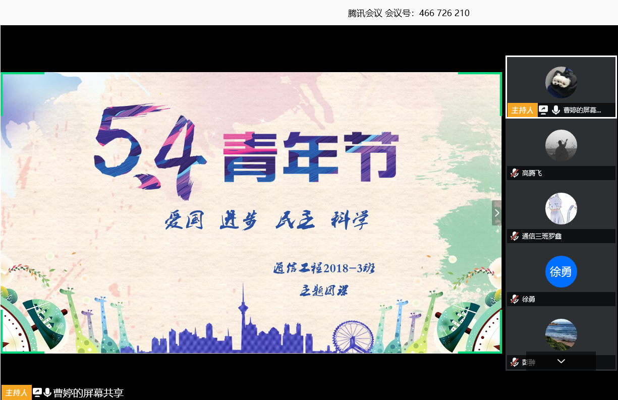 为响应团组织号召,4月30日,18通信三班利用网络开展“扬五四精神,展青春风采”主题活动。活动分为线上团课以及线下创意活动两部分,活动共持续7天,面向班内全体同学。此举旨在让大家深刻理解“五四精神”的深刻内涵并以行动将其传承弘扬。