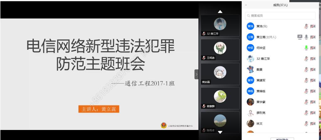 随着诈骗方法的不断增多,老员工被诈骗人数的不断提高,12月28日,17通信工程辅导员何仲坚组织召开线上反诈骗安全主题班会,班长黄立嵩主持。