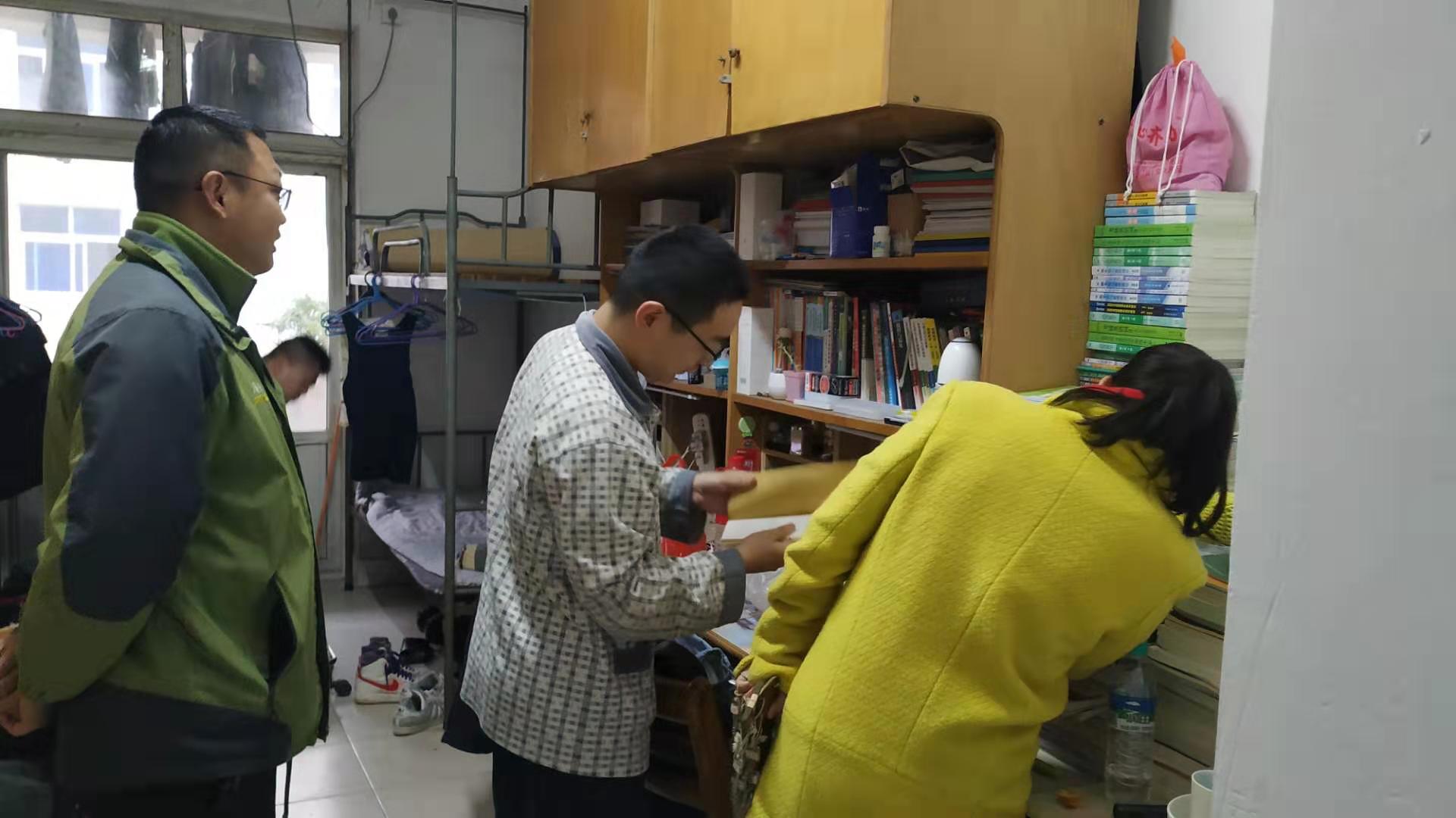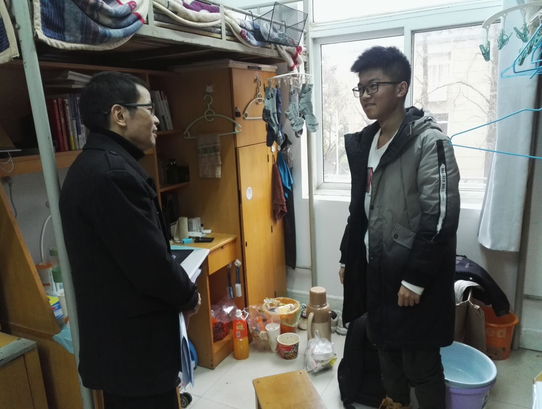 “你们寝室共有几个人留校,都打算什么时候回家?”全体老师前往宿舍看望留校员工,仔细询问同学们离校时间,并叮嘱他们离校注意安全。老师们提醒他们在离校前,门窗应锁好,水电开关关闭。