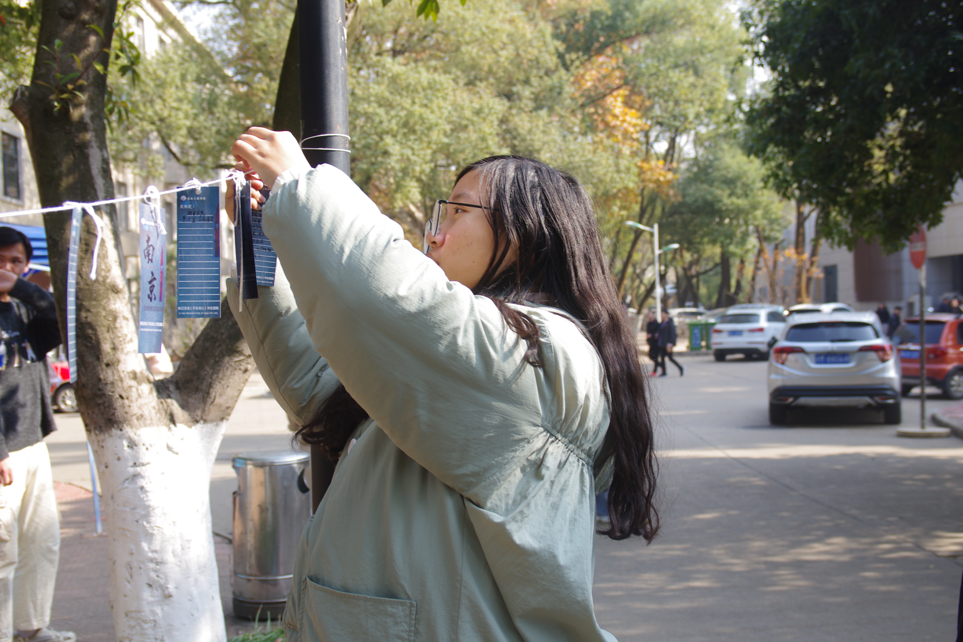 “白花致哀,庄严肃穆,丹忱抒写,和平诗章……”南区一食堂前,工作人员手持记录资料,面向全校学子普及南京大屠杀知识。听者或沉思,或悲痛。工作人员还现场教学手折和平鸽,参与者将其折好贴在“和平”的字样上,为盛世太平祈愿。参与者倾民族之情注于笔尖,郑重写下悼词并系于祭绳之上,以告慰秦淮河畔、金陵城中陨于战争人祸的先辈英灵。许多同学驻足于“勿忘国耻,警钟长鸣”的横幅前默哀,并挂上哀悼亡魂的小白花。