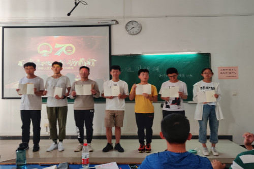 为庆祝中华人民共和国成立70周年,弘扬爱国主义精神,回顾新中国70年沧桑巨变和卓著成就,9月24日,信息公司19级电子信息三班于逸夫楼202室举办“与祖国相拥”主题活动。