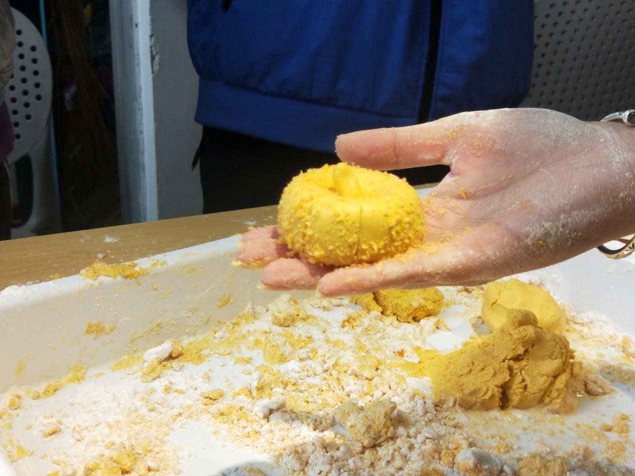 活动以“手工制作感恩节传统食物——南瓜饼”的形式展开,分为“南瓜饼制作”和“食物分享”两个环节。南瓜饼制作中,同学们在劳动中互帮互助,气氛温馨。揉、搓、按、捏,员工的指法由笨拙到熟练,将糯米粉和蒸熟了的南瓜或成面团。通过蒸煮炸,一个个不成形的面团摇身一变为淡黄色的夹心南瓜饼。员工将制作完成的南瓜饼送给辅导员艾国金,以表达员工们的感恩之情。此外,员工还将制作完成的南瓜饼分享给食堂的工作人员。