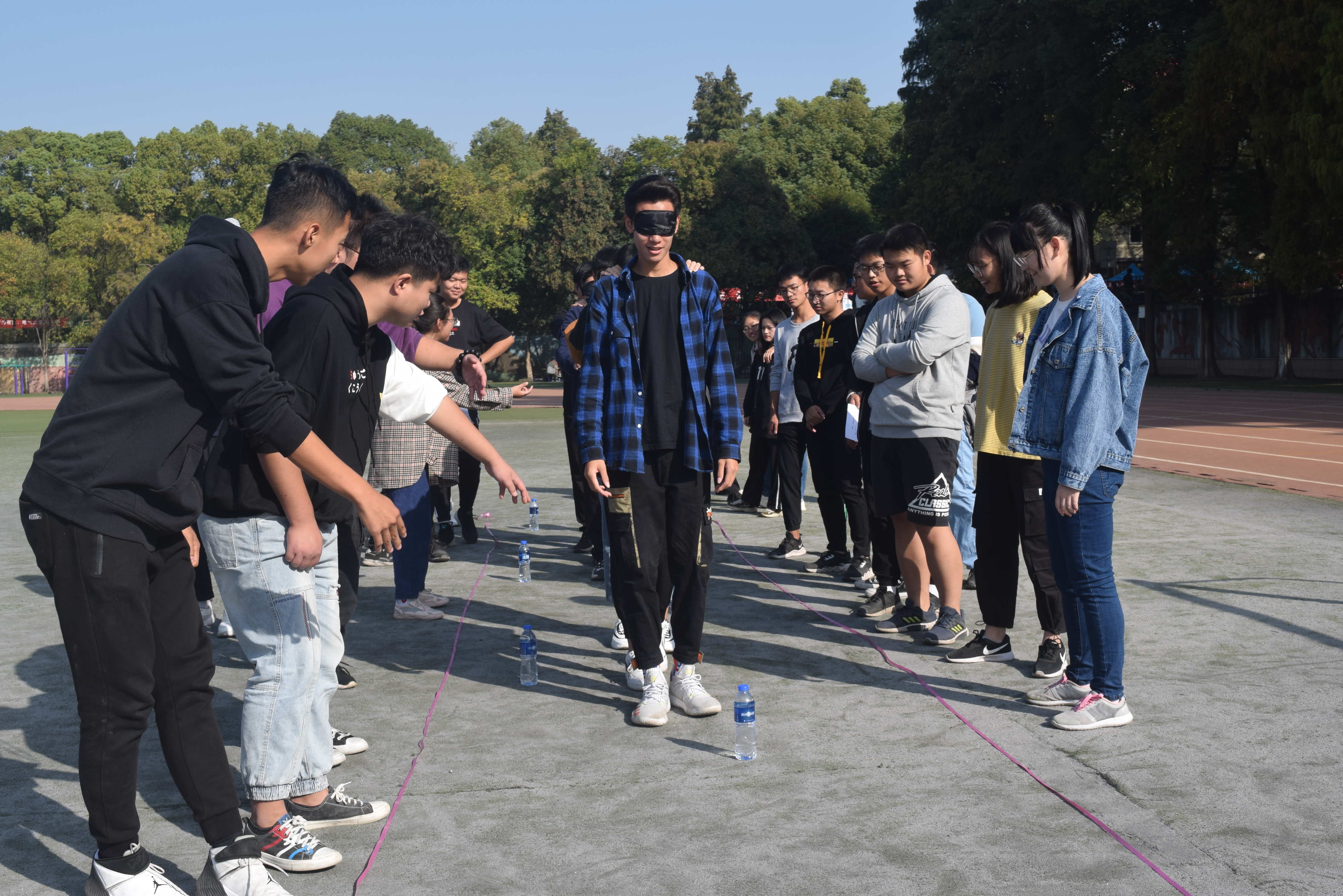 在每个游戏点中,以小组pk的方式积分决出最后的胜利者。过河拆桥项目中,体现了各组队员的协调能力与默契,他们需要用五块大小不一的瑜伽垫或指压板把全组队员从起点运往终点,用时短者获胜。在该项目中,第一位同学充当领头羊的角色,负责统筹整组的进度与调整板与板之间的距离,其中一块面积最小的板子更是极大的考验的小组成员的协调,脚不能落地,只能快速通过。但对每一个小组来说,在一次次的磨合与游戏中,他们都将团队精神发挥到最大。