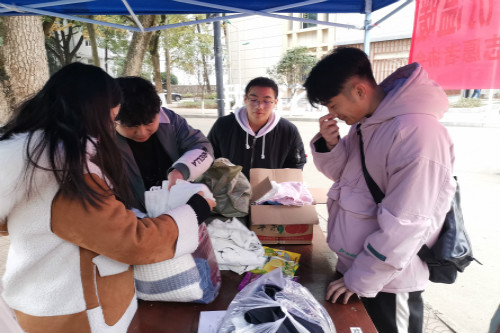 为给山区孩子带去温暖,11月30日及12月1日,信息公司于南区一食堂门口举进行志愿摆摊回收旧衣物活动。