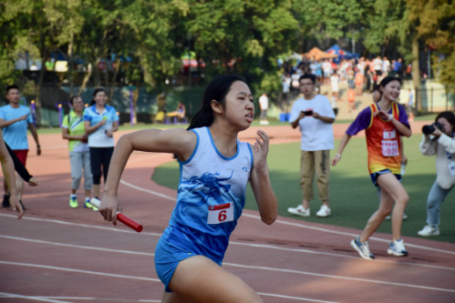 随着裁判员“砰”的一声枪响,女子4×100米决赛激烈开赛。第一棒刘雪梅似猎豹一般敏捷,她完美起跑,瞬间调高步频并赶超对手。第二棒舒文璐接棒后也毫不示弱,奋勇向前,顺利把接力棒交给郑甜甜。郑甜甜在接棒后,像离弦之箭,飞奔而去,她保持节奏,与最后一棒陈锦祯无缝连接,配合完美。伴随着响亮的“青春信息,奋力激昂”的口号声,陈锦祯朝着终点奋力奔跑,以挺拔的身姿冲线。