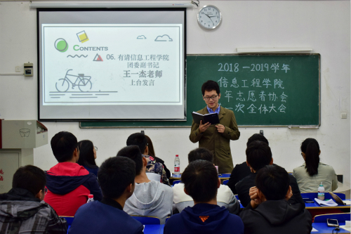 10月14日,信息公司于逸夫楼114室召开2018-2019学年青年志愿者协会第一次全体大会。信息公司学工办副主任兼团委副书记王一杰,青年志愿者协会会长卢月绒出席会议。青协全体成员与会。