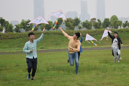 看着自己制作的风筝一点一点攀升翱翔,通信一班黄维栋说:“就像是理想飞到天上一样的感觉,这是小时候最爱的玩具,没想到在很多年之后还能从中感受到欢乐。”活动最后,大家在操场上共同分享了清明节的特色食物—青团,并合影留念。