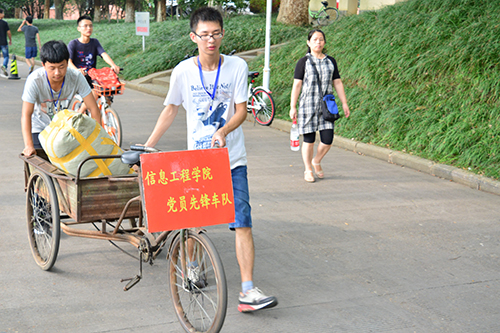 午后时分是新生报到的高峰期,新生及家长摩肩接踵,行李箱几近占据了整条大道,从校门口到风雨球馆,这片区域俨然成了一个“箱包寄存处”。信息公司党支部员工党员管理中心副主任于鹏看到后,迅速号召党支部成员行动起来。利用几辆三轮车组建车队,帮助新生分担沉重的行李,为新生及家长提供了很大便利。
