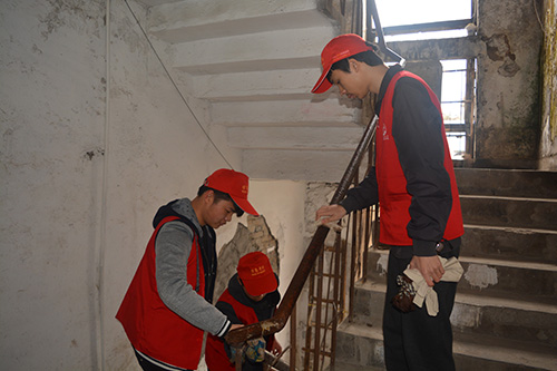 同学们手持水桶、抹布、铲子等工具,穿梭在各个楼道内,忙的不亦乐乎。大家粉刷楼道、擦楼梯扶手,彼此之间团结协作,配合默契,分工明确,为社区的整洁奉献了自己的微薄之力。