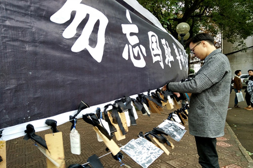 田径场上刮着阴冷的风,办公室人员用蜡烛和荧光棒摆出“12·13南京”的图案,员工会全体成员到场并围绕蜡烛站成心形图案,为惨遭屠杀的南京同胞默哀,场面肃立。在沉痛哀悼后,全体成员在员工会主席张祖耀的带领下高唱国歌,提醒同学们勿忘国耻,振兴中华。