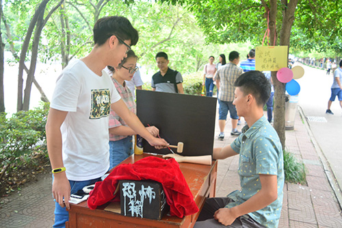 “按照心理学的观点,大部分心理问题来源于?”“心理健康的最终目标是什么?”……在心理问答摊位,一张张写着心理知识问题的彩色卡片被整齐地排放在桌子上,摊位旁边挤满了前来围观的同学,挑战者需要进行随机翻牌,并回答卡片上写着的相关问题,5题中答对4题可以得到一份小奖品;“啊!”一位正将手伸进“恐怖箱”的女同学发出一声尖叫,经过工作人员的同意,记者打开神秘诡异的“恐怖箱”,发现里面仅仅放着一些黏滑的海带和豆腐。对此,来自16计算机二班的李羽姿发出了“对未知的恐惧是最为阻碍人前进的东西,我们应该勇敢地去尝试”的感慨。