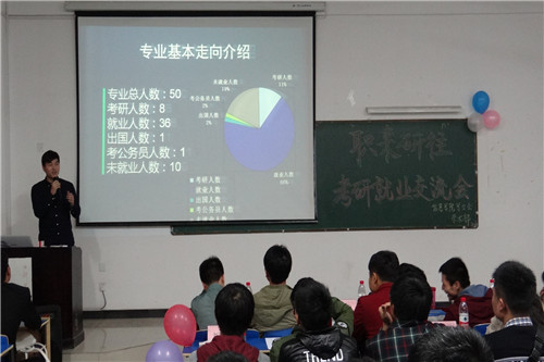 为减少和避免低年级同学在考研和就业方面的盲目性,激发同学们的学习与考研热情,4月24日,由员工会学术部承办的“职来研往”考研就业交流会于教14栋212室召开。资深考研分析师廖保老师、12级信息2班孟帅、12级计算机1班孙兴作为主讲嘉宾应邀出席本次交流会。