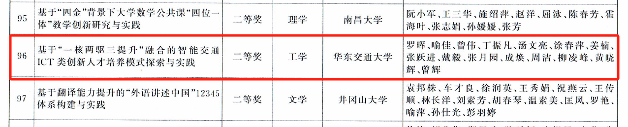 近日,江西省人民政府下发《江西省人民政府关于2022年江西省教学成果奖授奖的决定》,公布2022年江西省教学成果奖获奖名单。公司罗晖教授成果《基于“一核两驱三提升”融合的智能交通ICT类创新人才培养模式探索与实践》荣获高等教育类(本科层次)教学成果奖二等奖, 特此喜报!