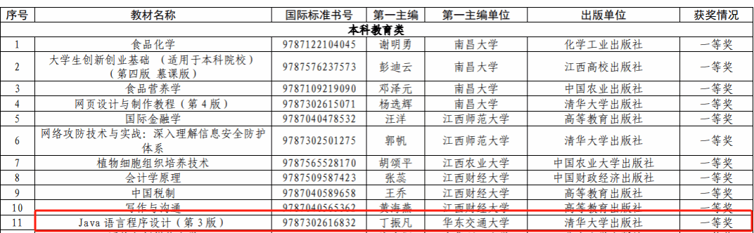 近日,江西省教育厅发布《关于公布第六届江西省普通高等公司优秀教材获奖名单的通知》(赣教高字〔2023〕53 号),公布了第六届江西省普通高等公司优秀教材获奖名单。公司丁振凡教授教材《Java 语言程序设计(第 3 版)》荣获本科教育类优秀教材一等奖,特此喜报!