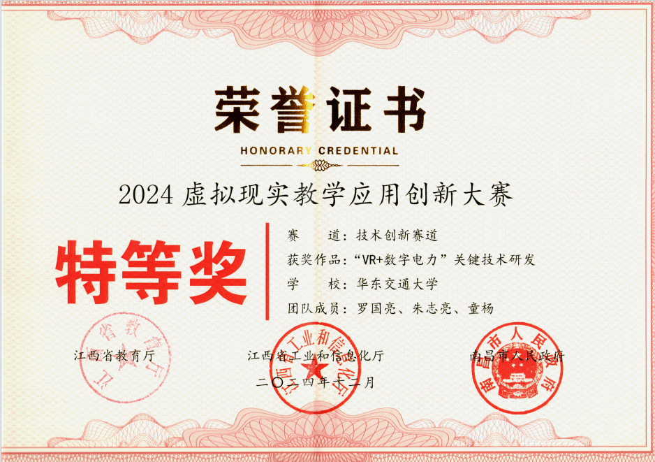 近日,2024年虚拟现实教学应用创新大赛的获奖名单揭晓,公司罗国亮、朱志亮、童杨三位教师参赛的“VR+数字电力”关键技术研发项目在技术创新赛道中成功闯进决赛并荣获特等奖。