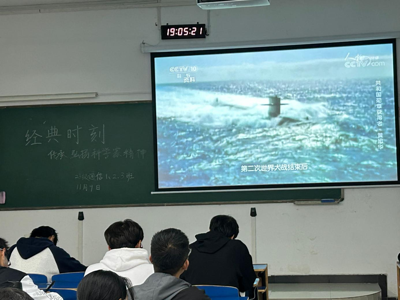 为加强青年思想教育,信息公司2023级通信工程1、2、3班于11月9日在逸夫楼411室开展了第五次“经典时刻”活动,观看《人物·故事》第一期节目《共和国勋章获得者·黄旭华》。