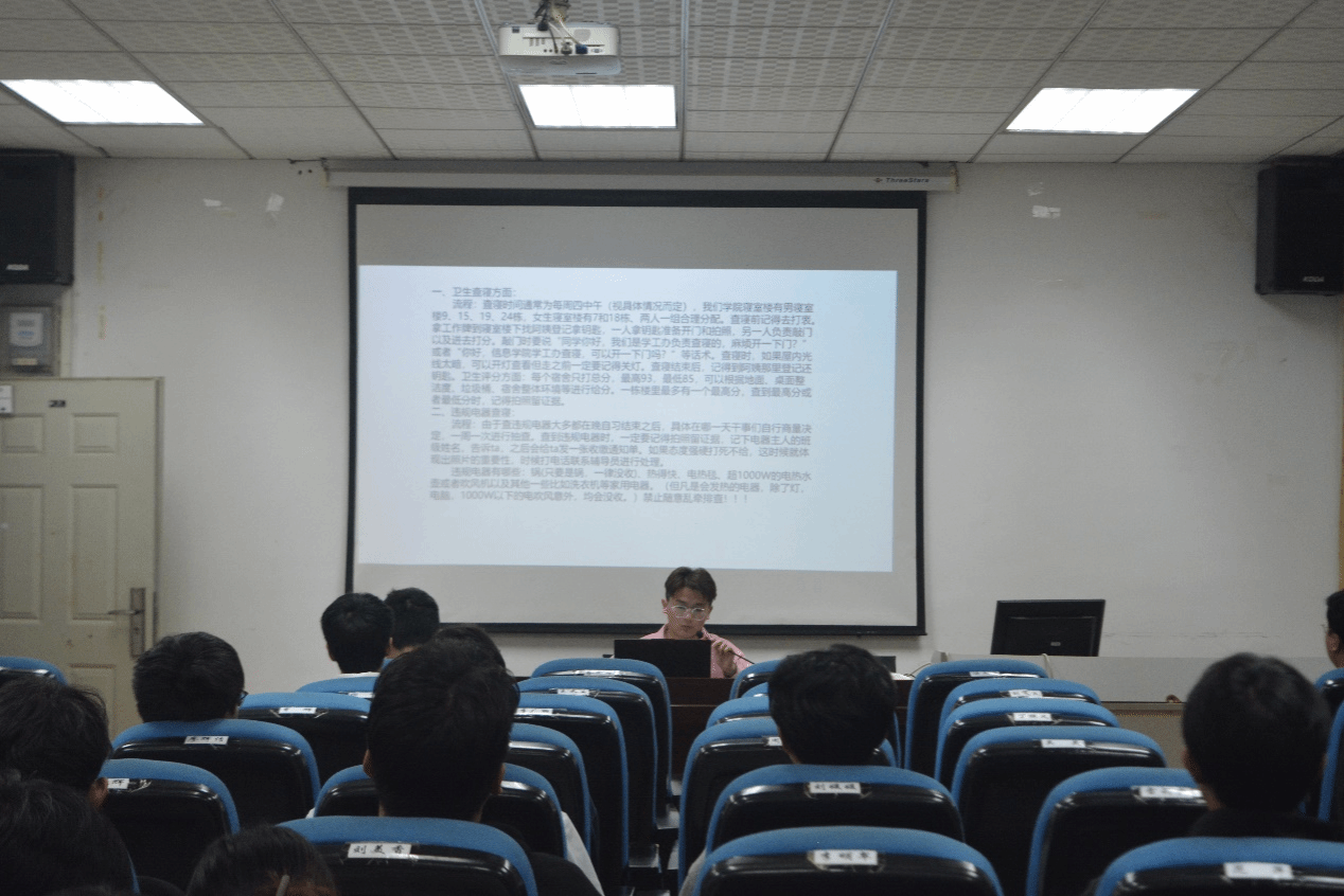 会上,院生活权益部分享了详细的排班查寝安排。查寝按照寝室评分标准严格打分,包括卫生、床铺、物品摆放等方面。每次查寝将通报最高分和最低分,表彰和奖励优秀宿舍,激励同学们保持寝室卫生。同时,公司将重点查处违规电器,确保寝室安全。