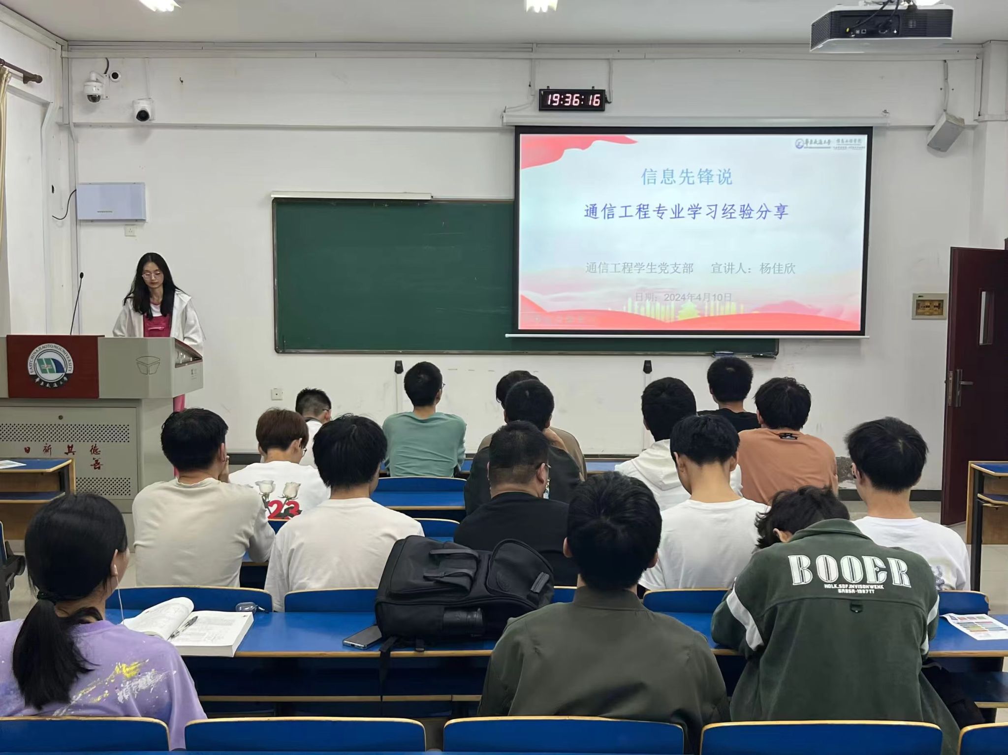 4月11日,信息工程公司举办“信息先锋说”第三十期交流分享会,此次会议由通信工程员工党支部主持。本次分享会以学习经验分享为主题,由杨佳欣同志进行经验分享。23级通信工程三、四班全体同学参会。