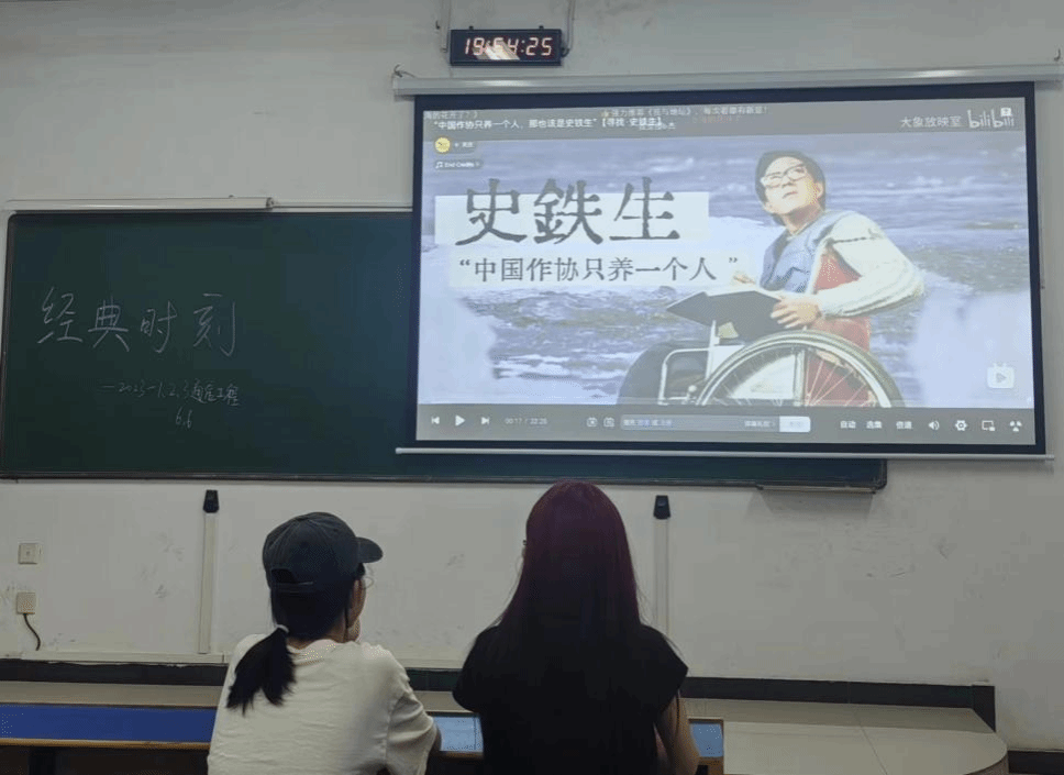 为提升同学们的人文素养,提升思想境界,信息公司通信工程2023-1、2、3班于6月6日在逸夫楼415教室开展了第二十一次“经典时刻”活动——观看视频《寻找史铁生》。