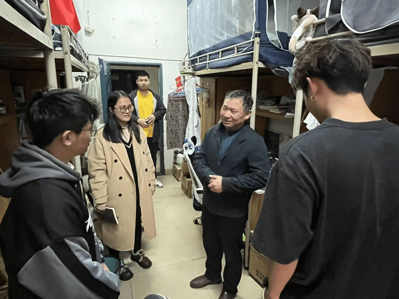 最后,官雪辉与辅导员吴曼丽一起来到了2022级通信工程专业男生宿舍,针对同学们一些生活上的问题给出建议,传授了一些寝室生活技巧。官雪辉还特别强调了宿舍安全问题,提醒同学们生活中要注意用电安全、遵守宿舍管理规定等,共同营造一个安全、和谐的宿舍环境。