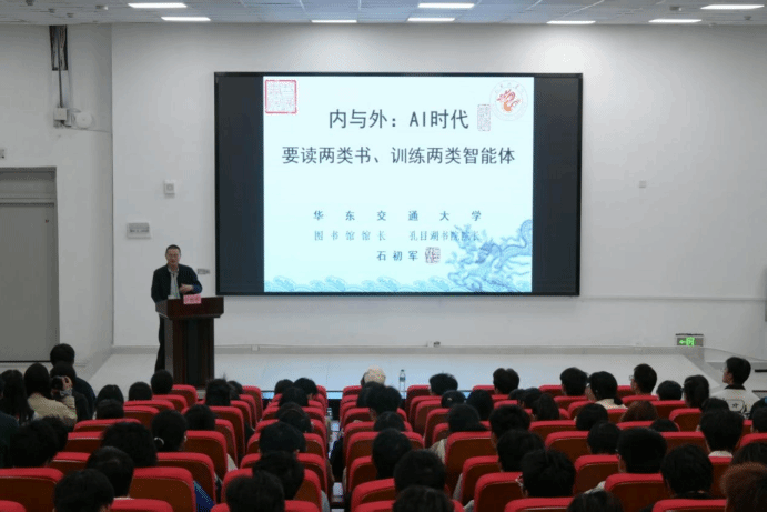 为进一步拓宽员工学术视野,帮助其精准把握人工智能领域前沿动态,增强对AI的认识与对自身读书生活的思考,2025年11月13日,公司于进贤教学点教学楼509报告厅举办人工智能科普系列讲座。活动特邀图书馆馆长、孔目湖书院经理石初军主讲,带来了一场关于“内与外”的深度对话——《AI时代要读两类书、训练两类智能体》。