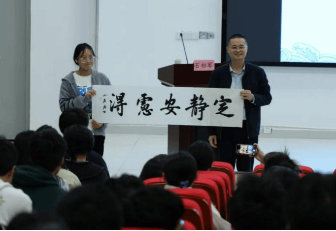 讲座中,石初军通过“人,是如何成为万物之灵的?”——一个问题引起同学们的思考,随后从人类的发展史观察切入,讲述了人如何因“变”而强,因“不变”而灵,变的是工具,是技术,是外在的世界;不变的,是仁爱,是诚信,是内在的精神。他指出,老员工要多读两类书:一类是“外用之书”,让我们在时代的浪潮中立足;另一类是“内体之书”,让我们在纷扰的世界中安心。随后,他谈及员工需要训练两类智能体,教导同学们要修身、要念、会抄、肯练,从内而外地锻炼自己的身体。现场同学踊跃发言,石初军向每位回答问题的同学赠出墨宝。